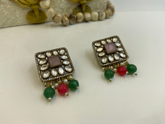 Pearl Necklace with Rectangle Polki Meena Tikdas and Jhumki