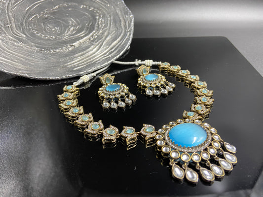Fashionable Polki Set with Lotus Flower Strings and Blue Doublet Stones in Centre