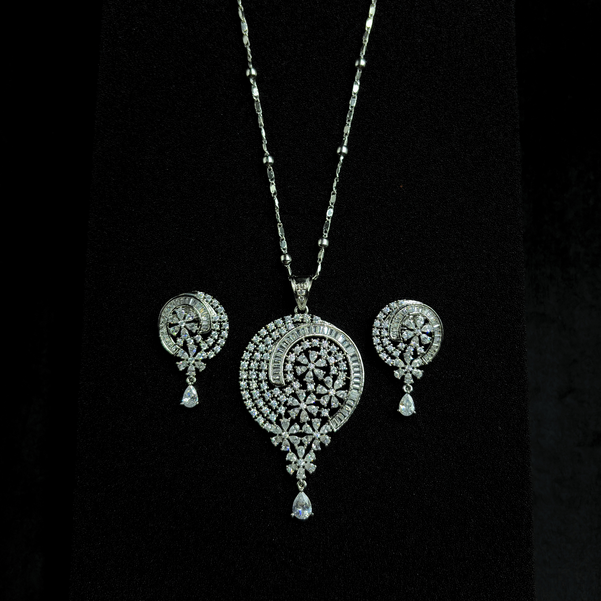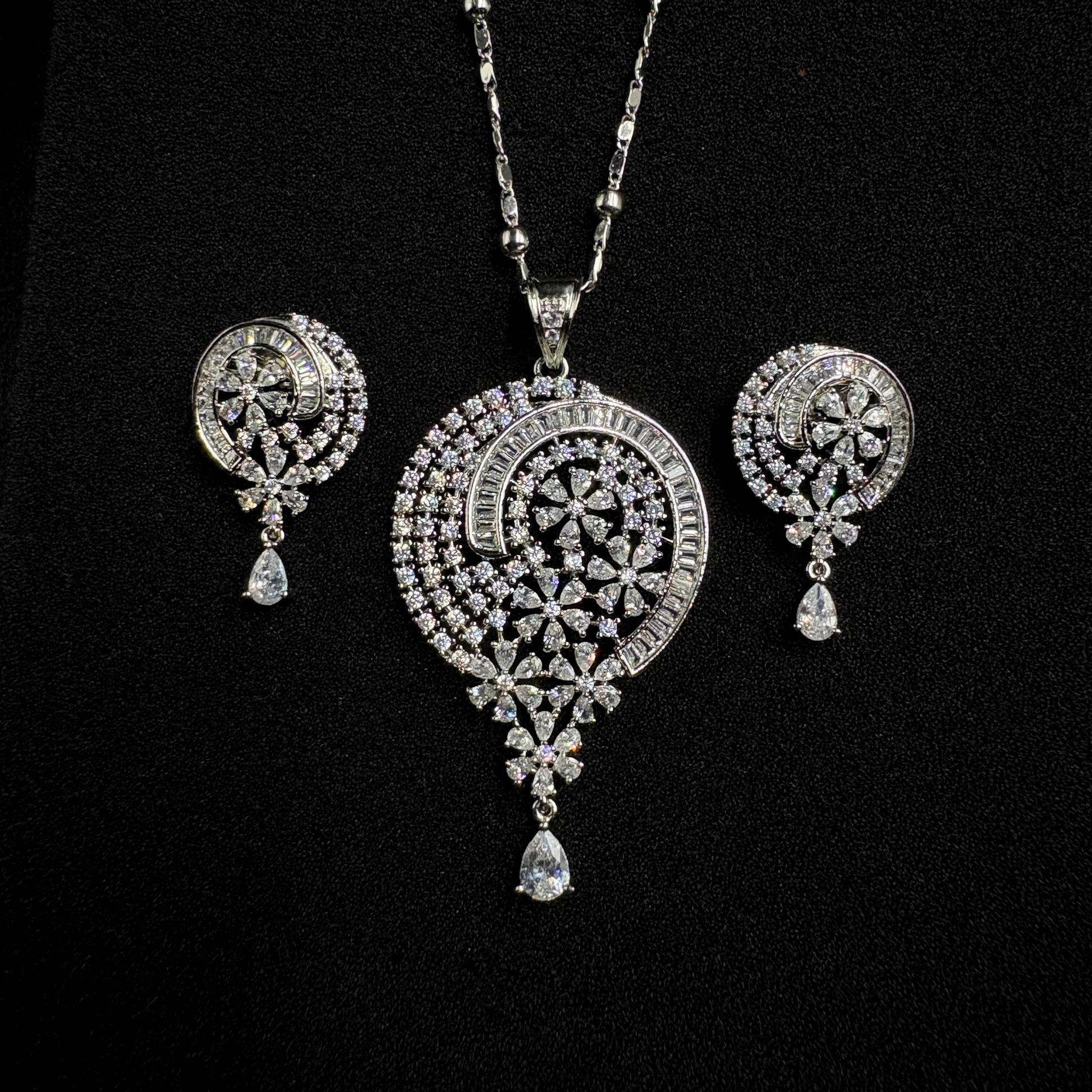 This pendant set is a breathtaking harmony of cosmic elegance and floral beauty. The teardrop-shaped pendant is adorned with a starburst floral motif at its center, encircled by layers of sparkling cubic zirconia and baguette-cut stones in a graceful crescent arc. The delicate teardrop danglers at the bottom add fluid movement, mirrored by the matching earrings for a complete celestial charm.