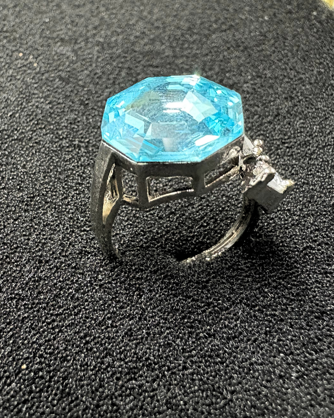 Illuminate your style with the radiant brilliance of this captivating cocktail ring. The centerpiece is a stunning, octagon-cut fancy yellow/peach/red/iridescent/blue Swarovski Crystal, its vibrant. The crystal's unique cut and intense color create a mesmerizing focal point, guaranteed to turn heads.
