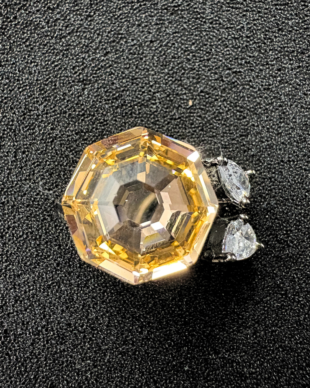 The yellow/peach/red/iridescent/blue crystal is flanked by two pear-shaped marquise diamonds, adding a touch of elegant contrast and enhancing the overall sparkle of the ring. These marquise-shaped diamonds are set in a darker setting, creating a dramatic contrast with the vibrant Swarovski Crystals.