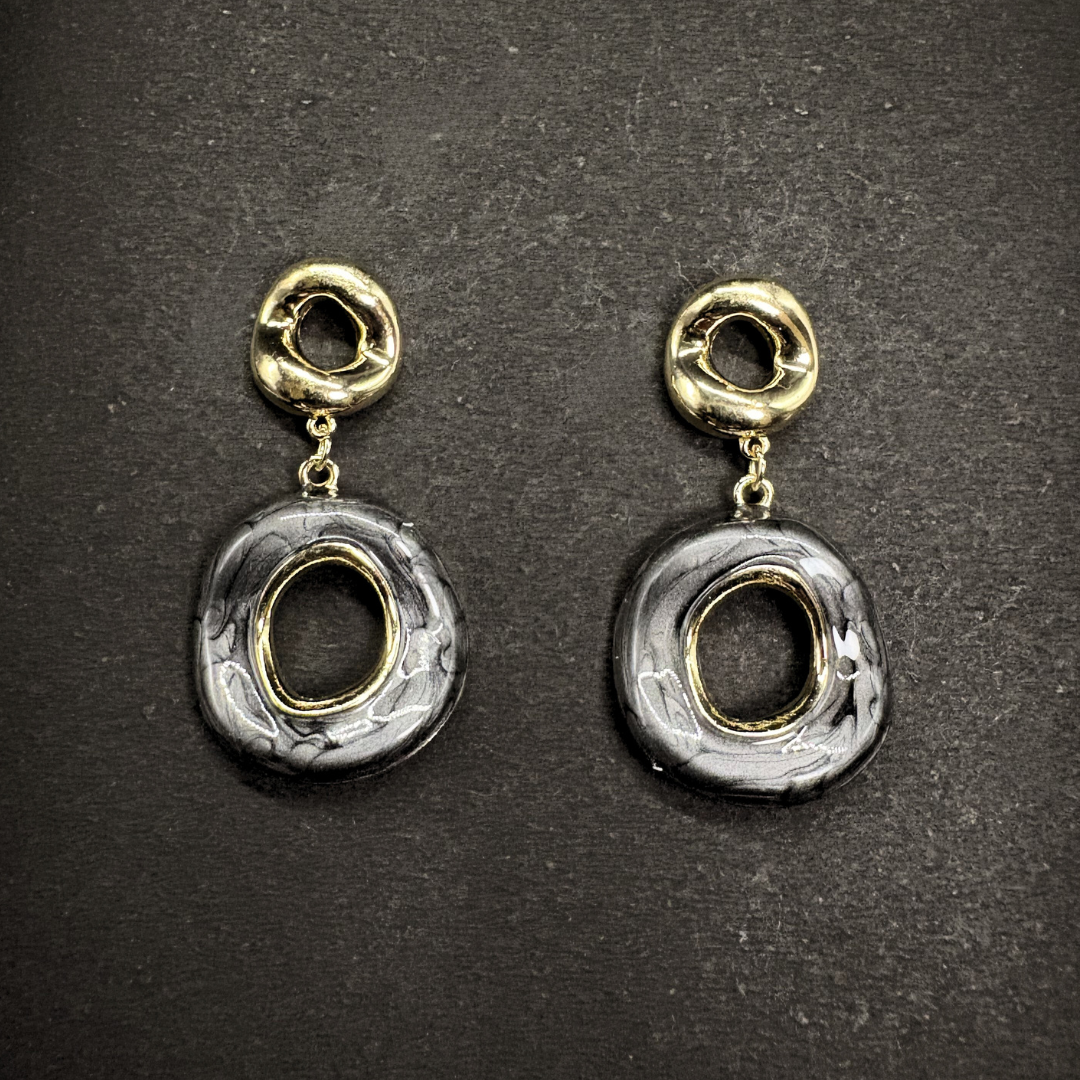 A striking blend of contemporary design and organic texture, these earrings feature a smooth, irregular marbled disc suspended from a polished gold-plated hoop stud. The fluid grey-and-white finish gives each piece a unique artistic character, while the bold circular cut-out adds depth and architectural appeal. Minimal yet statement-making, these drops feel elevated, wearable, and effortlessly chic for both day and evening looks.