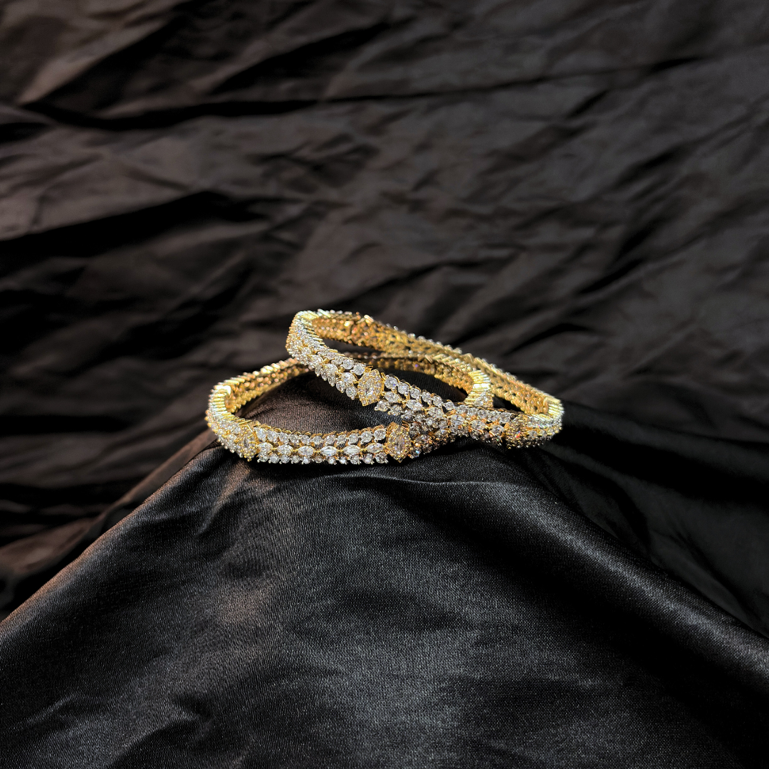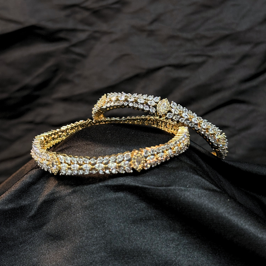 Designed to shimmer with every movement, these bangles feature a graceful cascade of stones set in a fluid, overlapping silhouette. The intertwined pattern creates depth, sparkle, and dimension, giving the pair a rich, couture-inspired look that instantly elevates festive and evening ensembles. Crafted to feel luxurious yet wearable, they bring together brilliance and sophistication in perfect harmony.