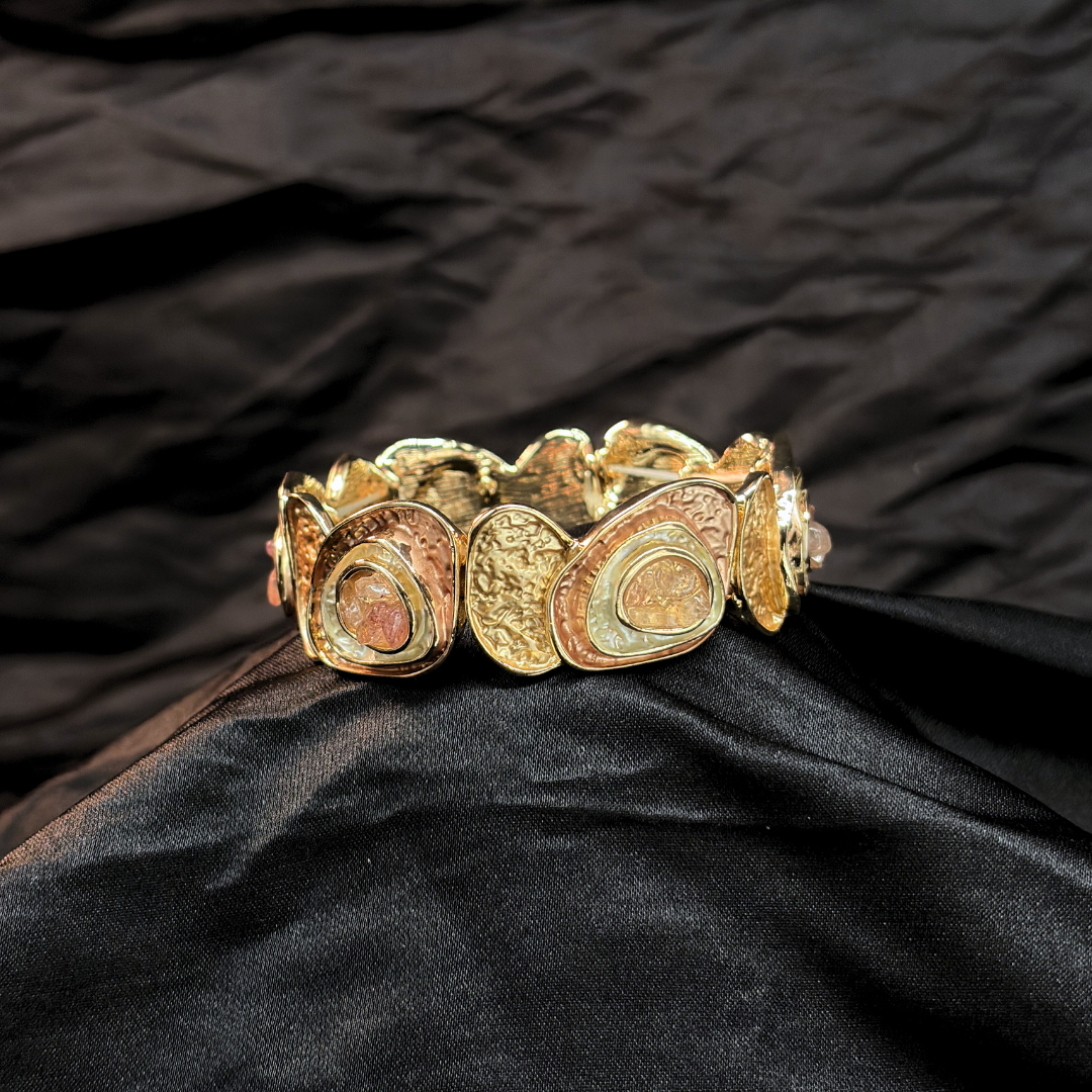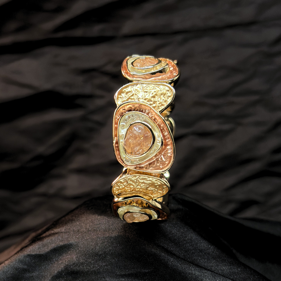 A statement in texture and tone, this adjustable elastic bracelet features sculpted oval motifs in layered gold hues, each panel finished with artisanal detailing that reflects light with subtle richness. Designed to stretch comfortably for a perfect fit, it blends bold design with everyday ease — making it a versatile piece that transitions seamlessly from day elegance to evening sophistication.