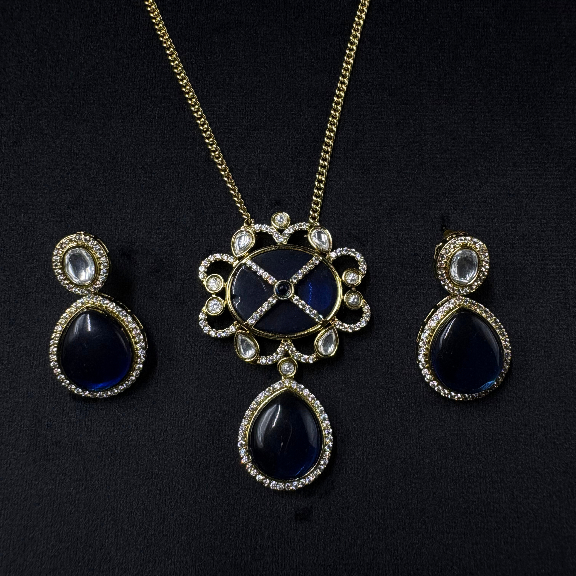 Drape yourself in royalty with our Midnight Majesty Pendant Set, an opulent piece that commands attention with its deep blue tones and majestic detailing. The pendant showcases a regal oval centerpiece, surrounded by a halo of intricate motifs and sparkling accents, giving it a vintage royal charm with a modern finish.