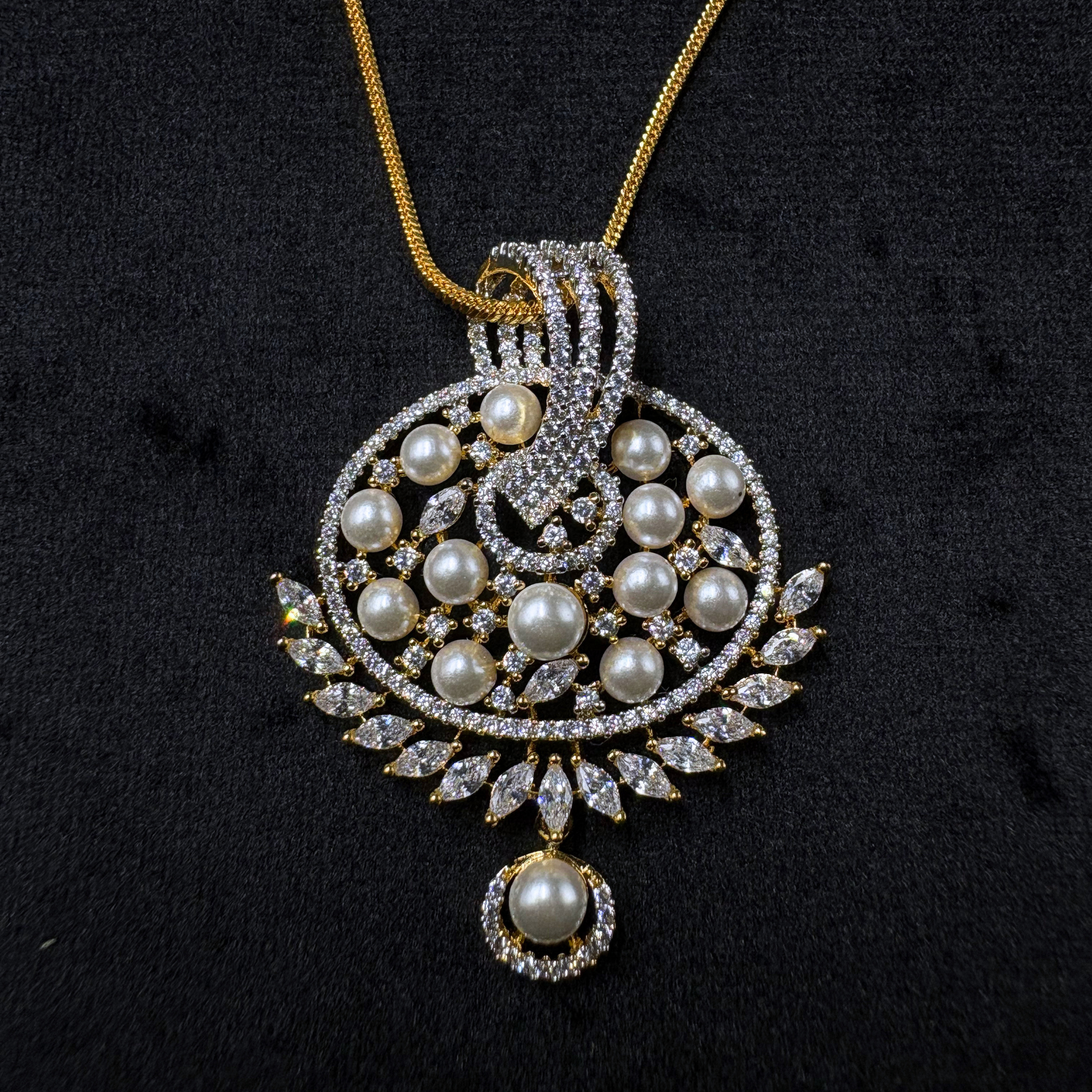 Elevate your ethnic look with our Motiya Noor, a stunning fusion of regal charm and contemporary elegance. This exquisite round pendant is encrusted with lustrous pearls and dazzling CZ stones, forming a harmonious balance between subtle grace and sparkling brilliance.