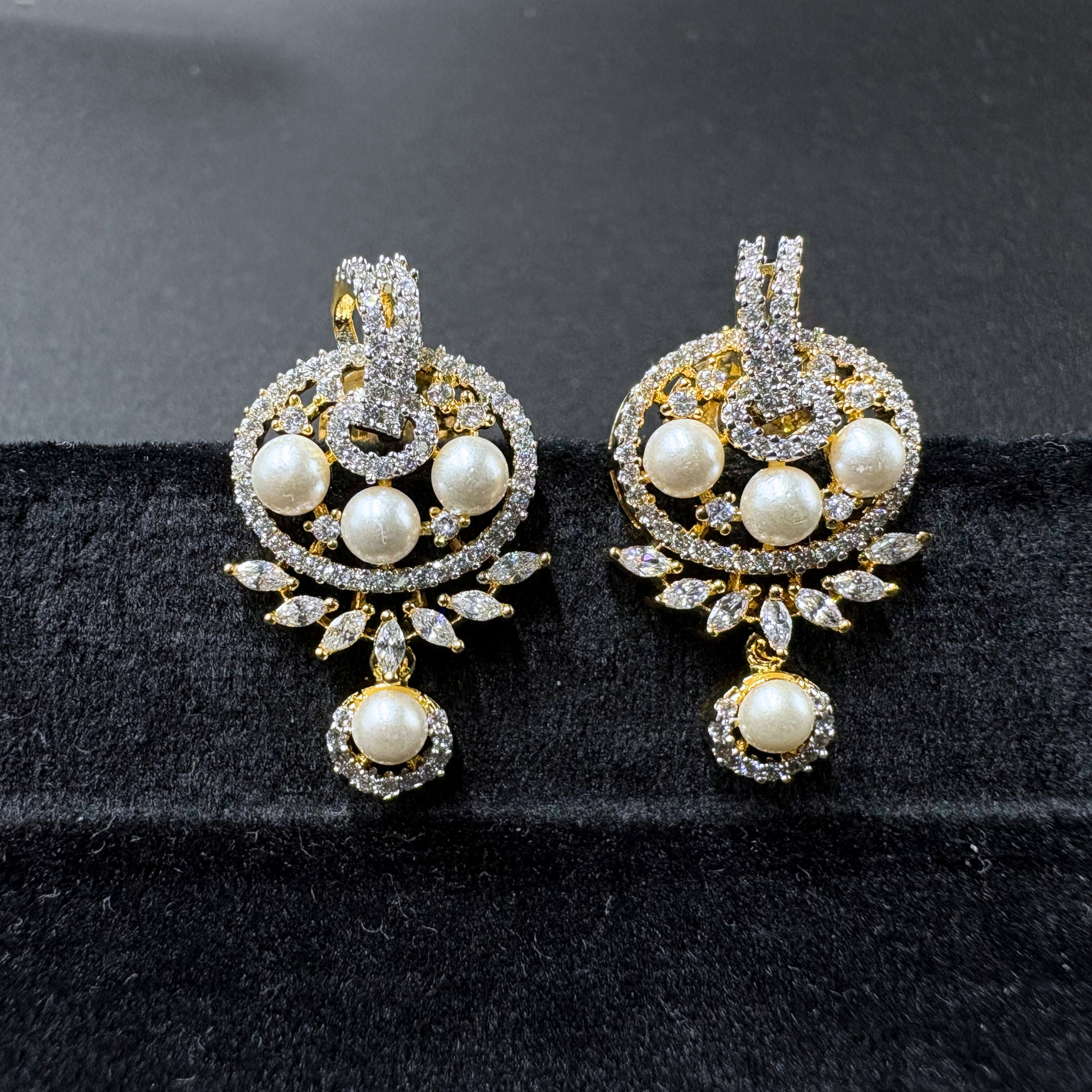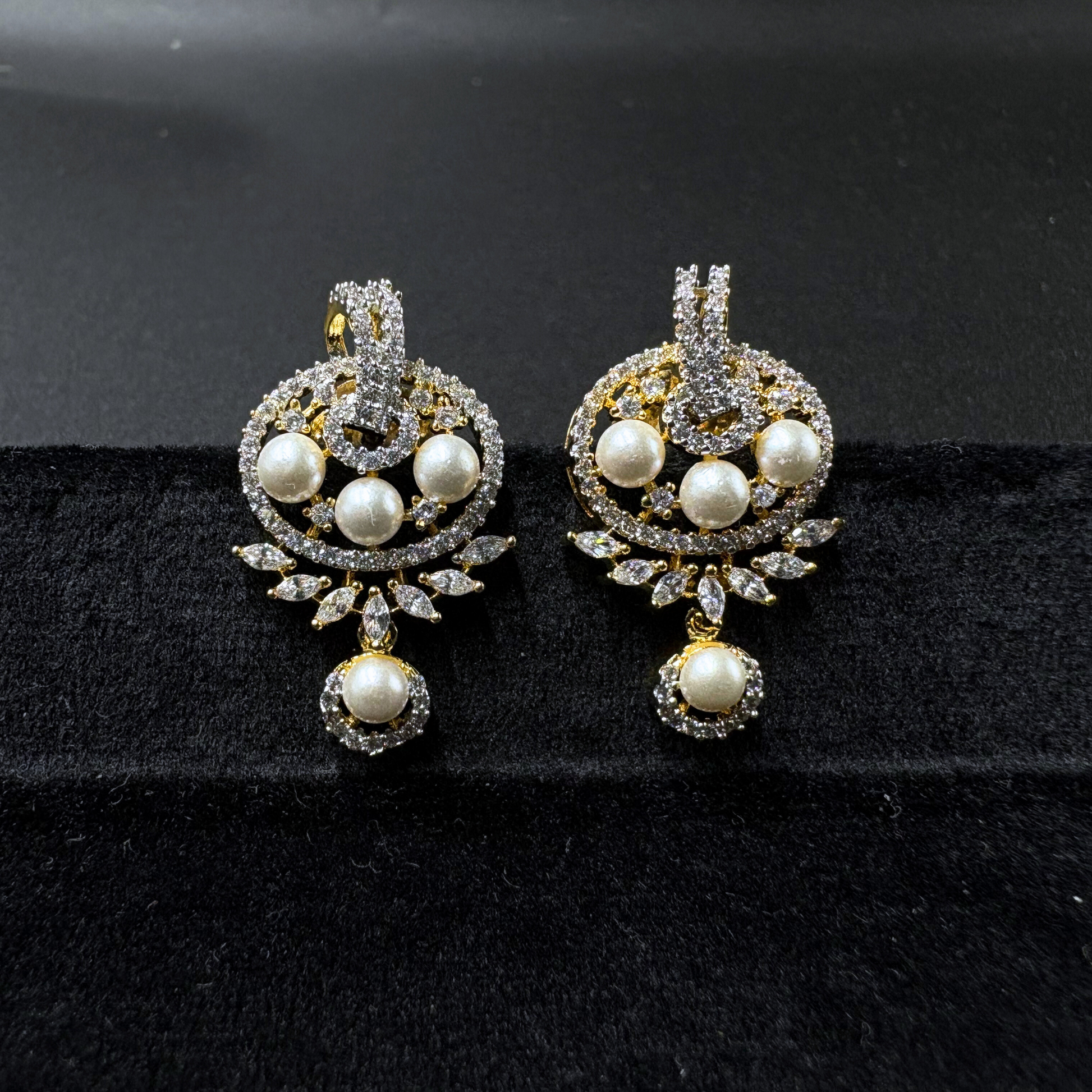 The matching earrings echo the pendant’s design with cascading pearl drops and intricate curves, creating a look that is both majestic and graceful.