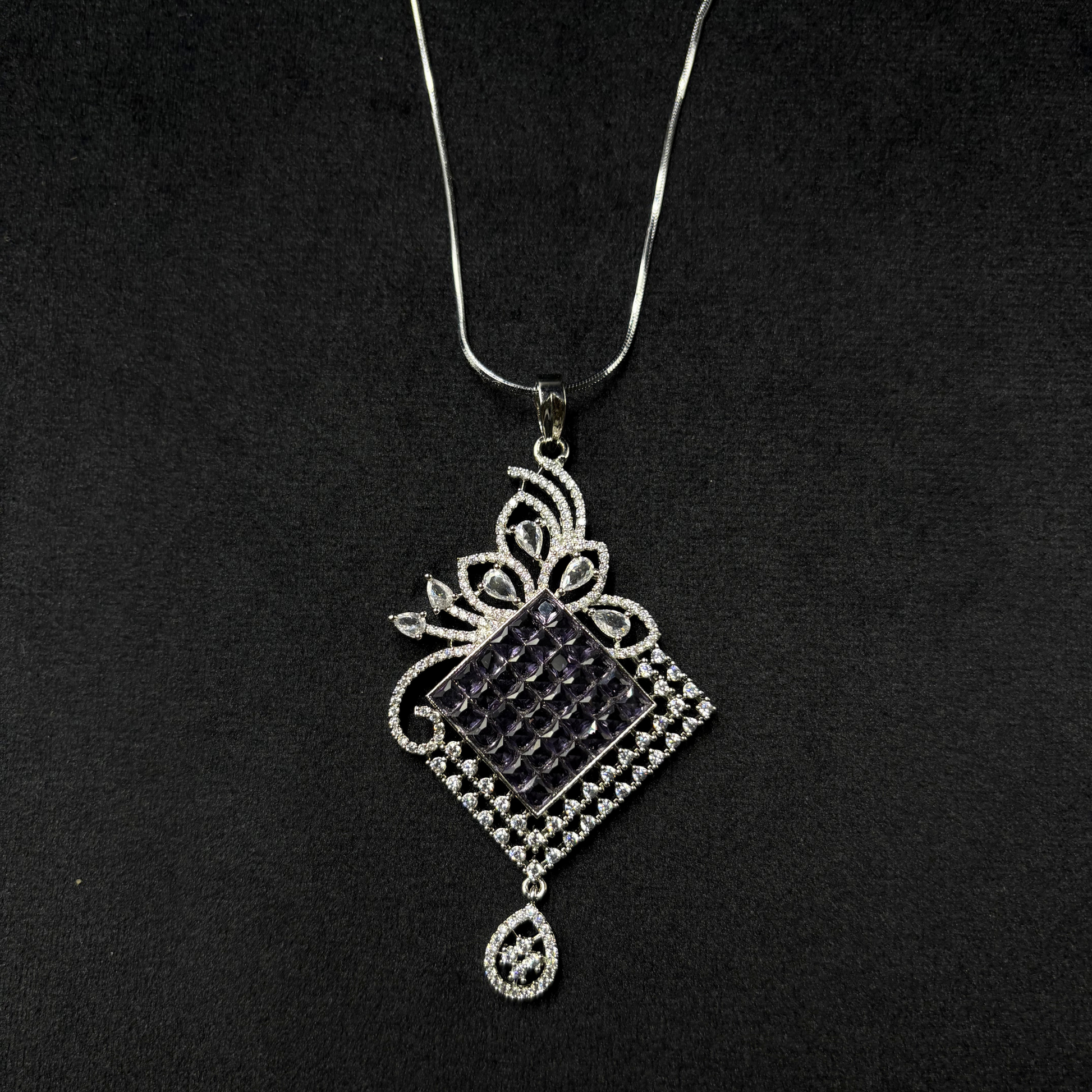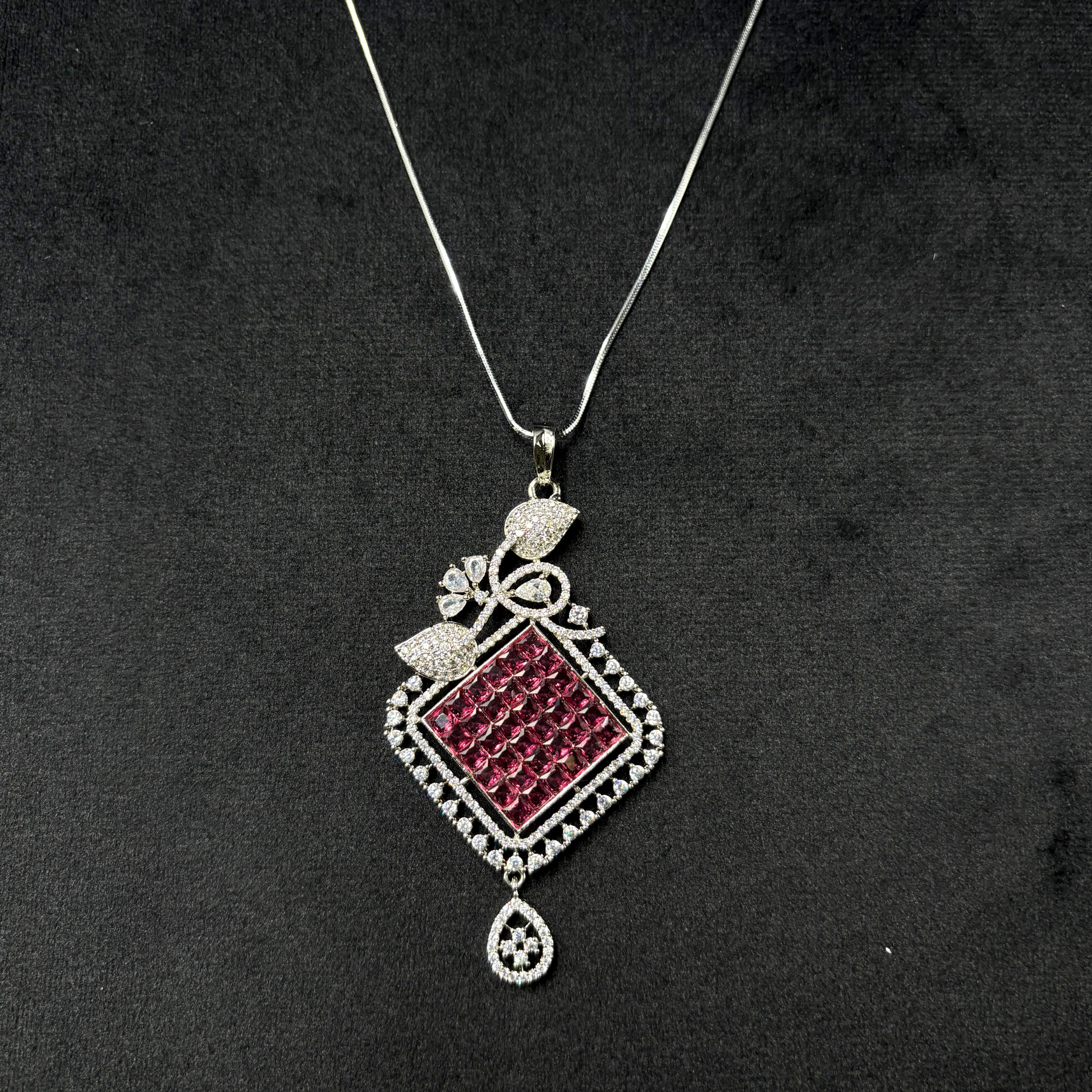 This striking pendant set features a mesmerizing square centerpiece with a grid of sparkling stones, framed by delicate diamond accents and crowned with floral-inspired motifs. Finished with a teardrop charm for extra elegance, this design comes in four captivating variants — radiant blue, royal purple, lush green, and fiery red — giving you the freedom to match your unique style.