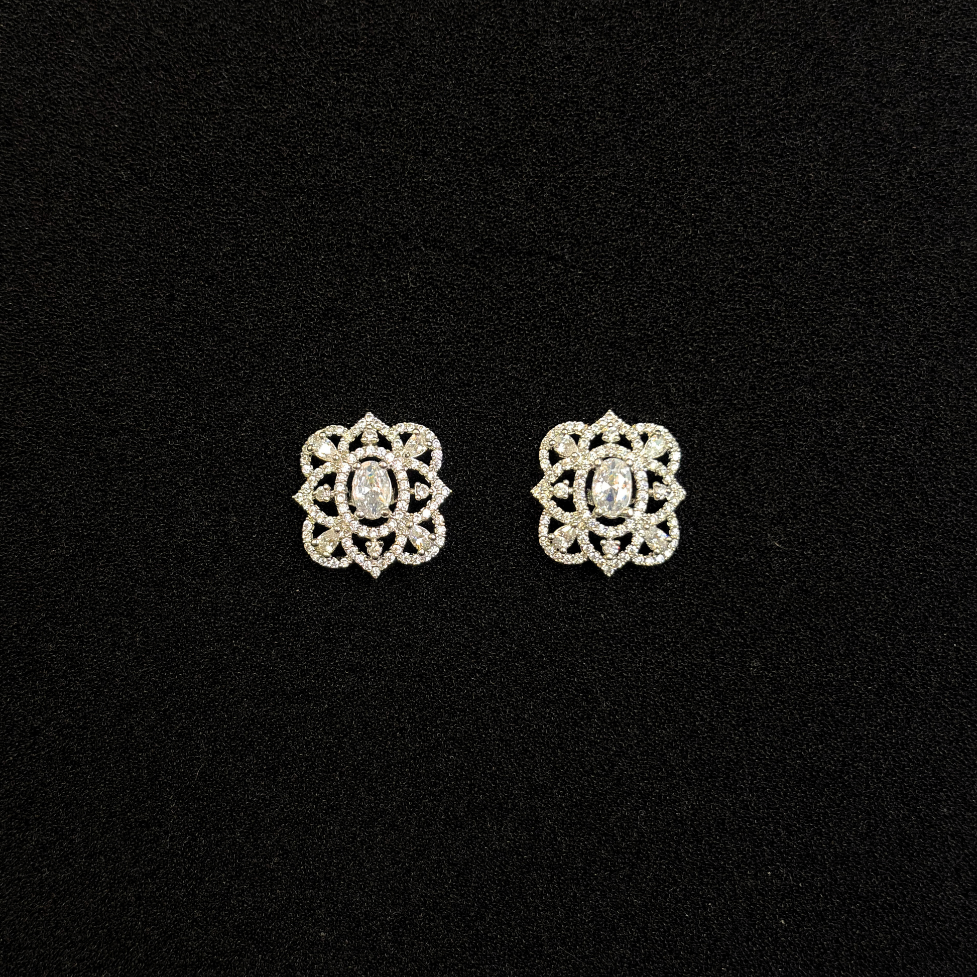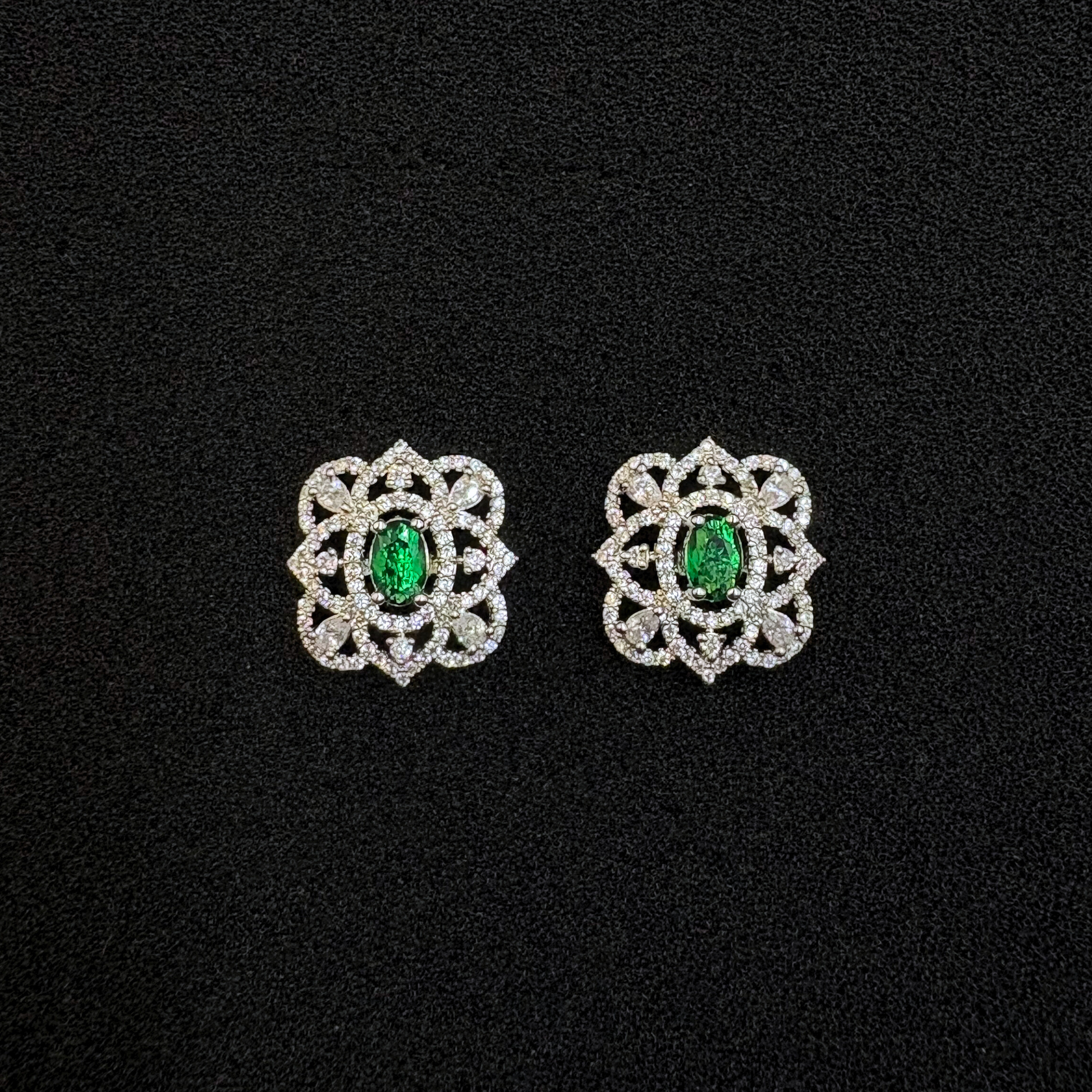 These stunning earrings feature a regal floral lattice design, centered with a vibrant oval emerald stone that radiates luxury. The intricate pattern is delicately encrusted with sparkling cubic zirconia, creating a dazzling contrast against the deep green centerpiece. Perfect for women who adore jewellery that embodies both elegance and grandeur.