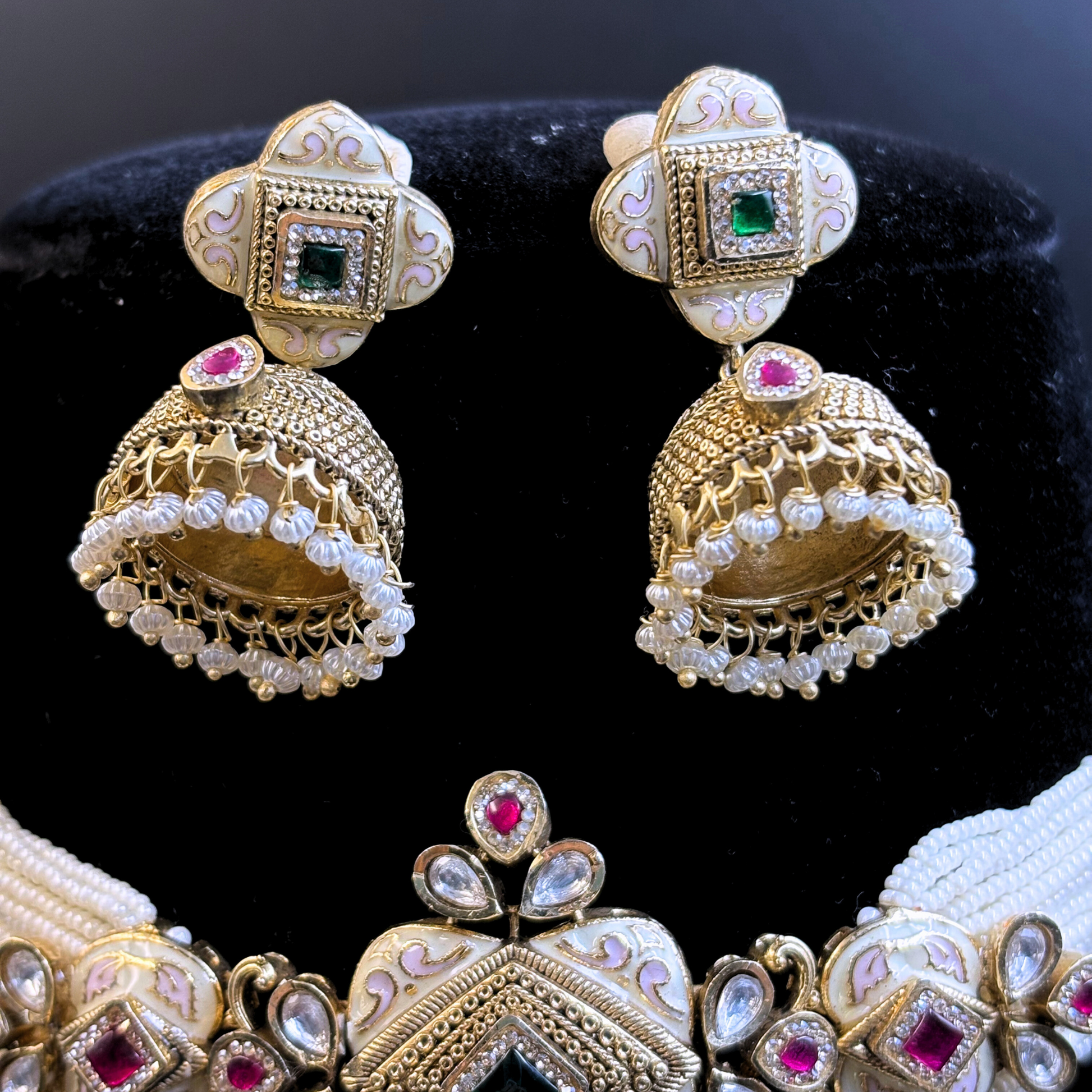 Pearl Necklace with Rectangle Polki Meena Tikdas and Jhumki
