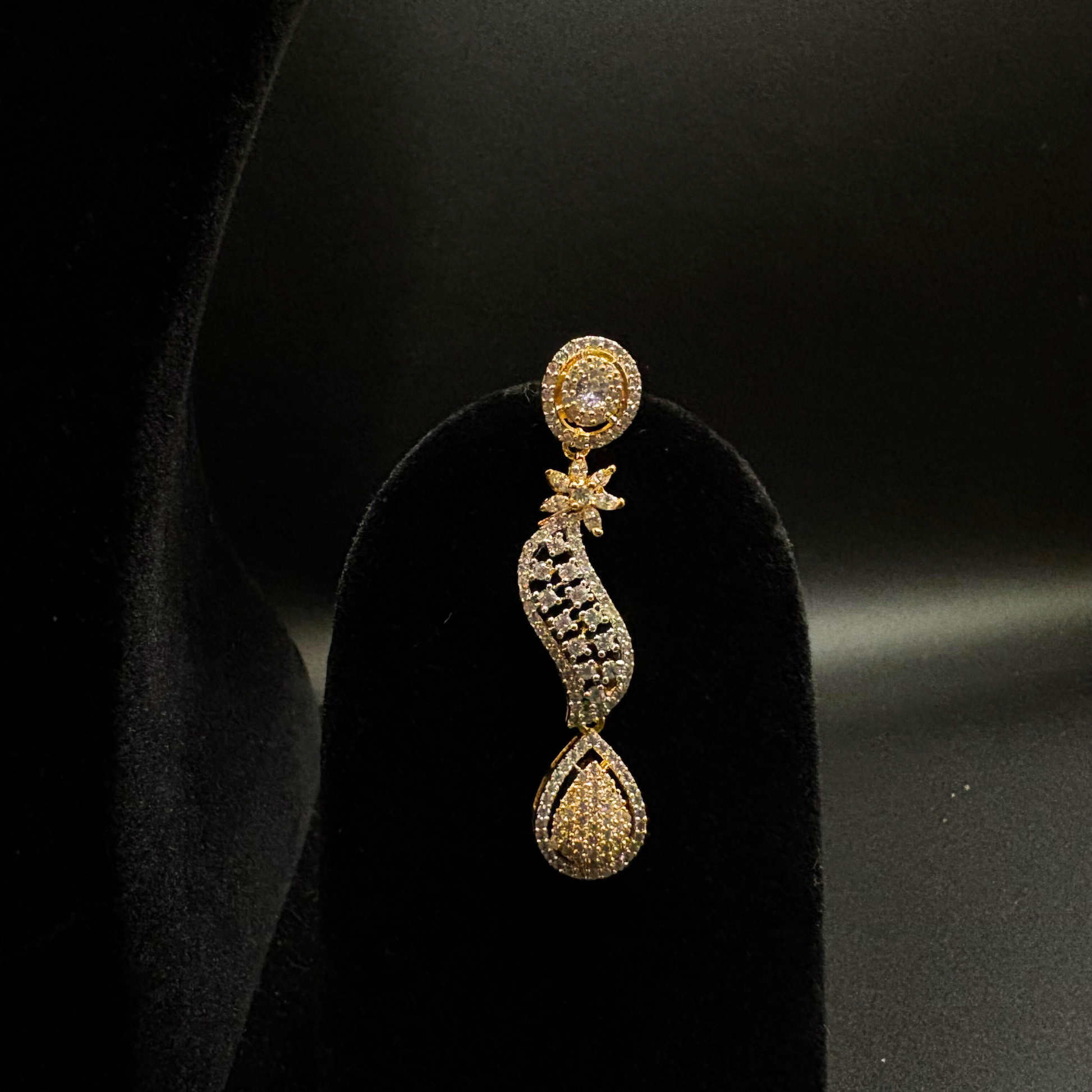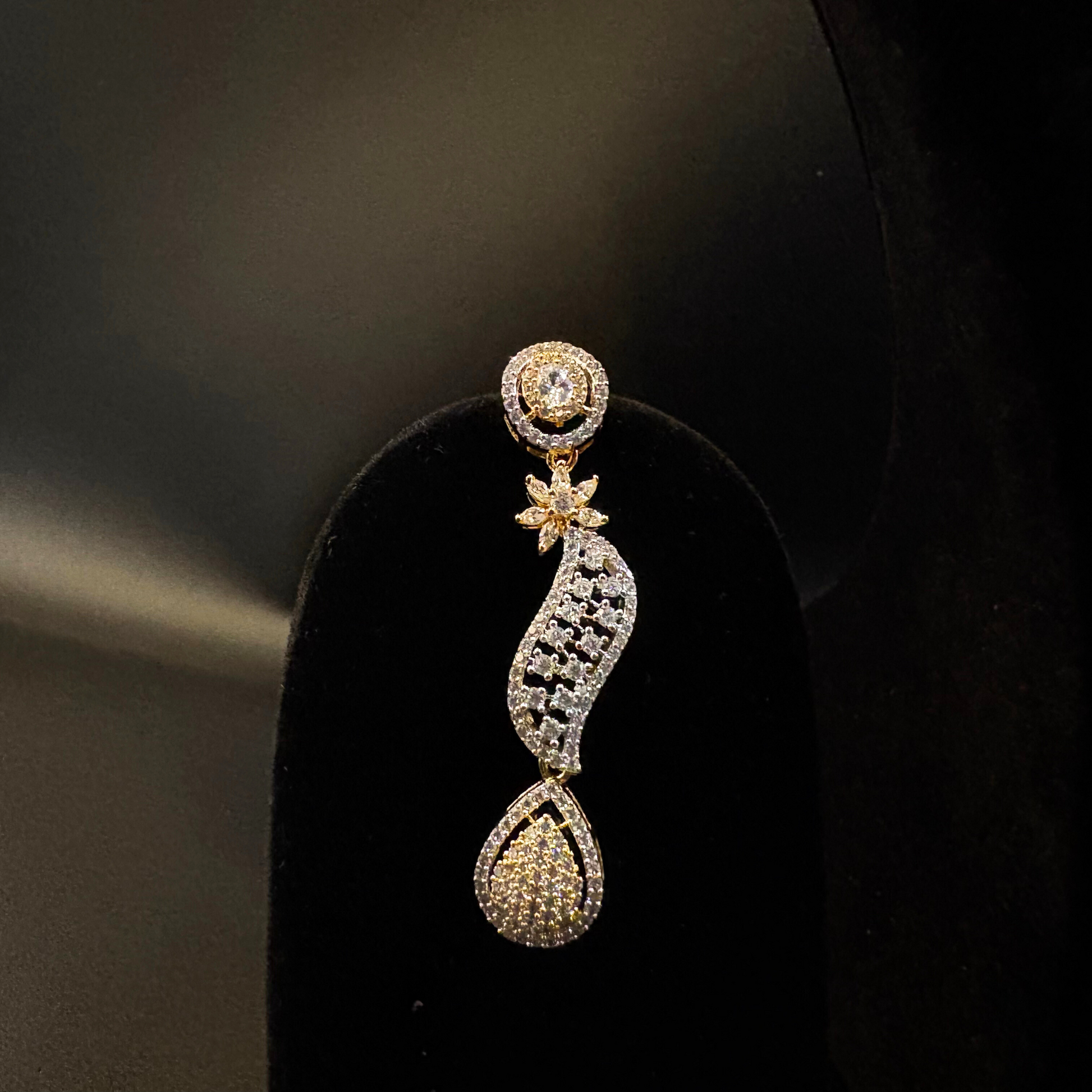This necklace set showcases a radiant gold-toned chain adorned with intricate stone-studded motifs, leading to a central teardrop pendant that exudes timeless charm. Paired with beautifully coordinated earrings in a wavy design ending in matching teardrops, the set strikes a perfect balance between elegance and modern artistry.