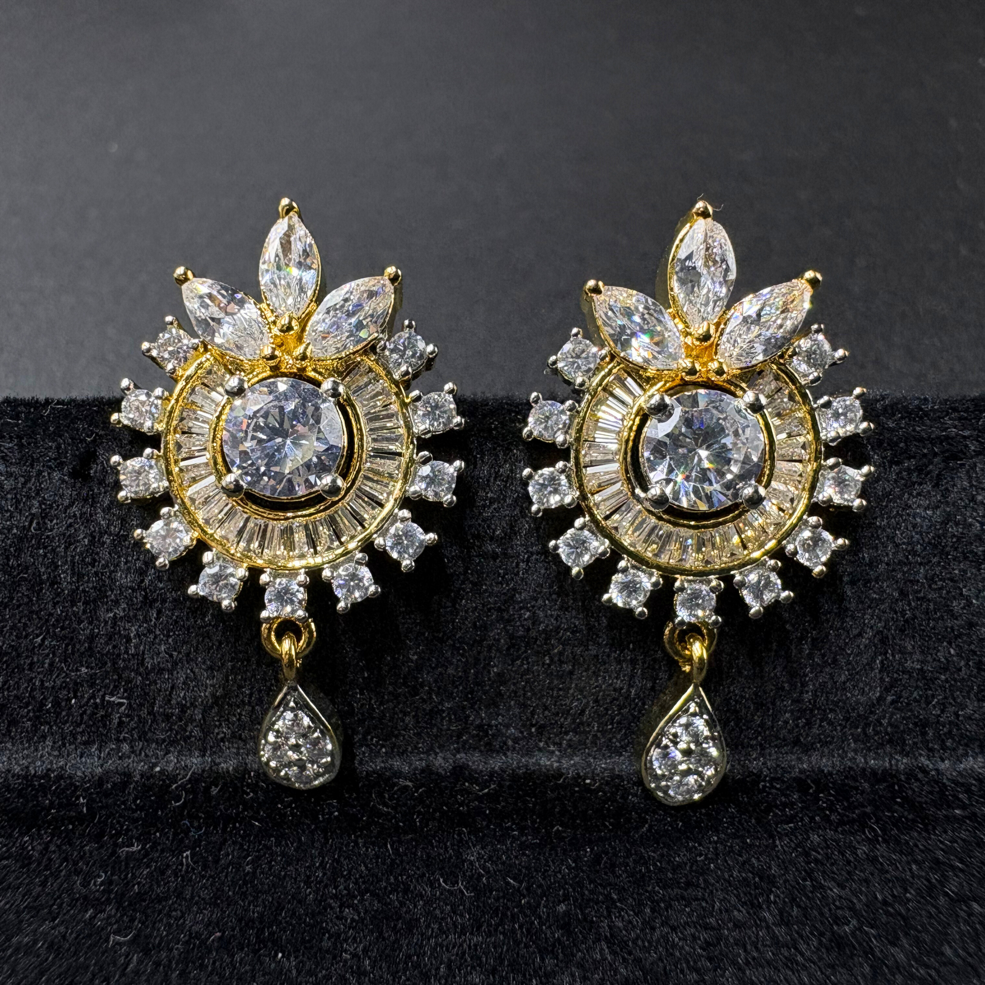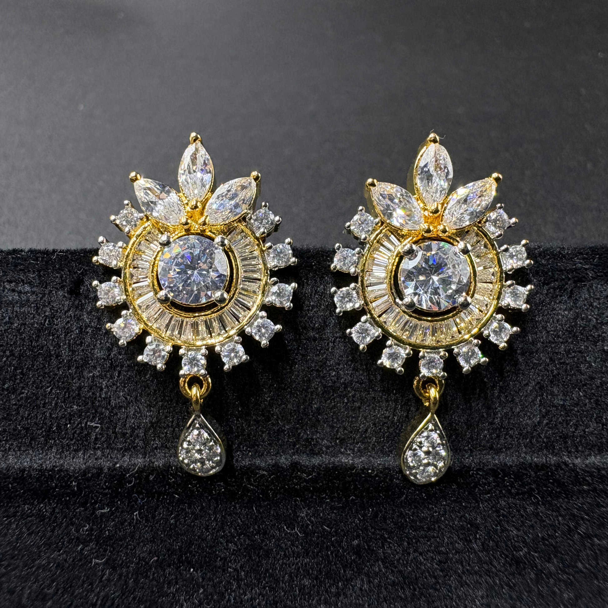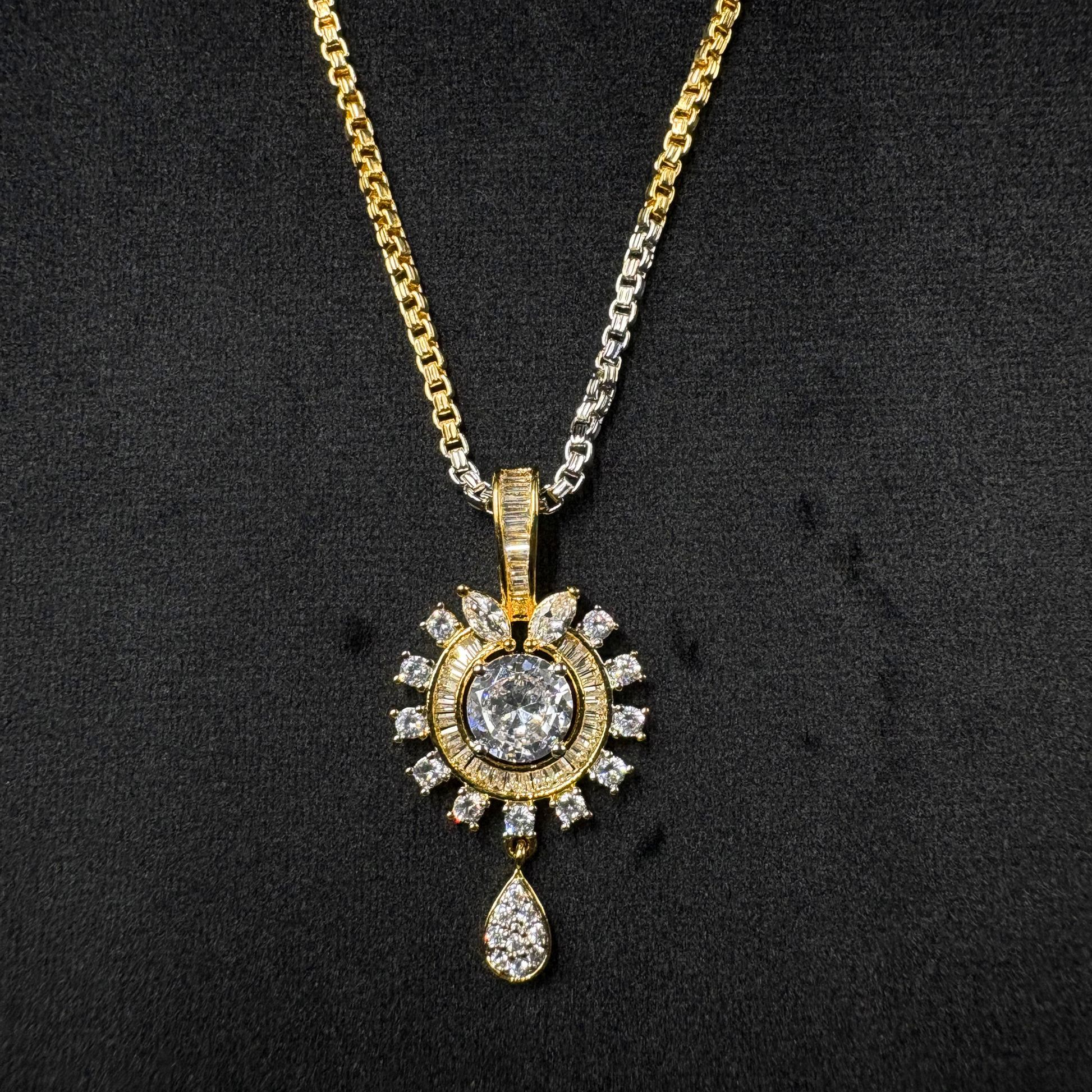 Turn every occasion into a moment of pure glamour with this dual-tone pendant set. Featuring a radiant sunburst design adorned with sparkling cubic zirconia and a graceful teardrop dangler, this set blends modern sophistication with timeless elegance. The matching earrings add the perfect finishing touch, making it a stunning choice for weddings, festive celebrations, or special gifting.