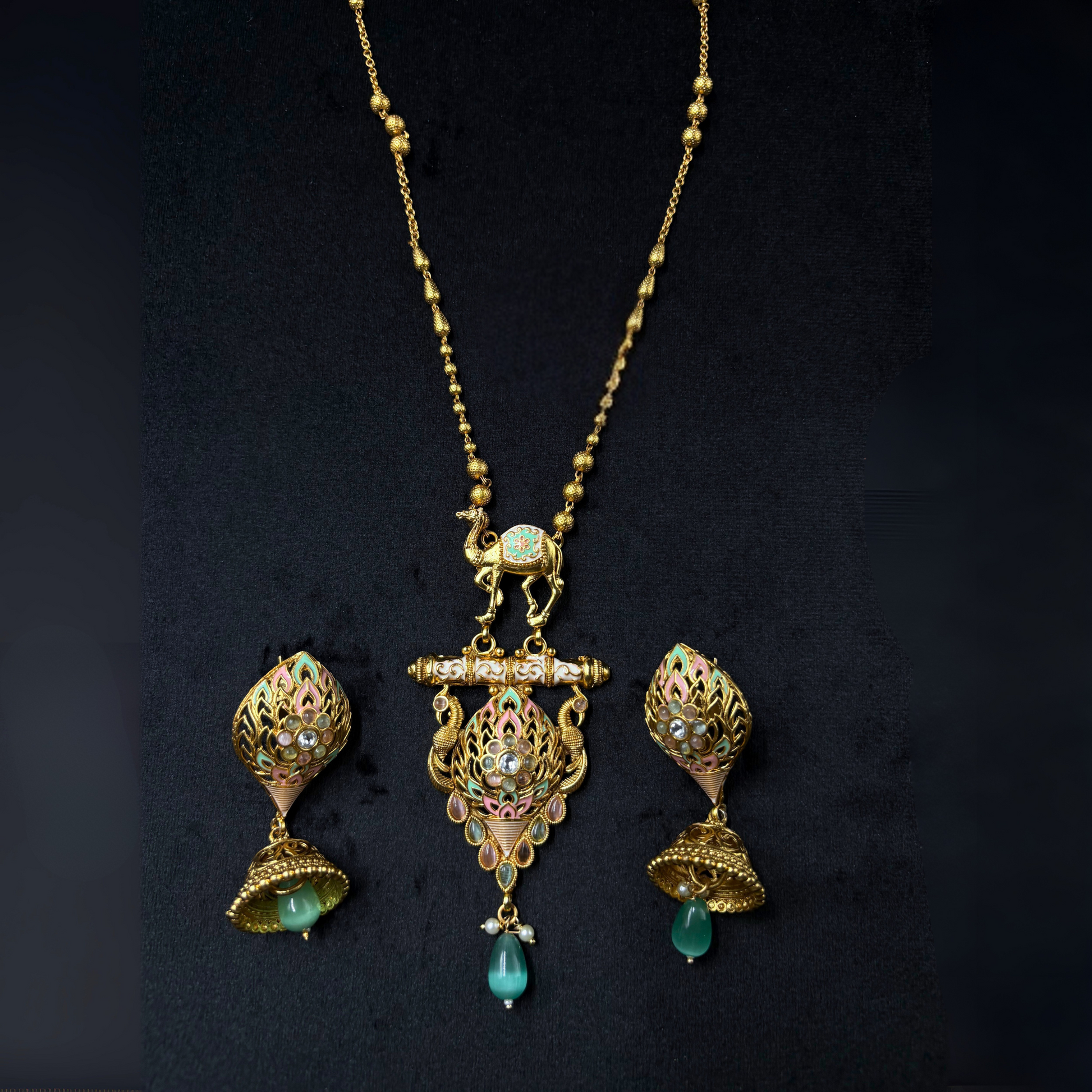 Turn heads with this striking Desert Royalty Pendant Set, featuring a regal camel motif and intricate filigree work that brings heritage to life. The pendant is a wearable piece of art, delicately handcrafted and adorned with elegant drops and soft pastel accents.